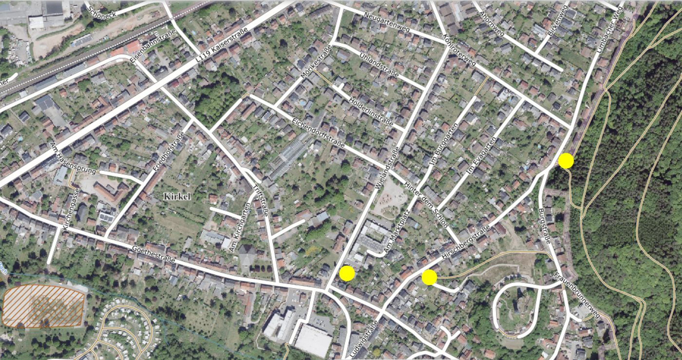- Limbacher Weg, Abschnitt vor Gabelung Hirschbergstraße/ Burgstraße: Eintrag von oberflächigen Abflusskonzentrationen und Material aus dem Waldgebiet, konzentriert entlang zweier Waldwege / u.a. Anlagenunterhaltung der Außengebiets- und Oberflächenentwässerung